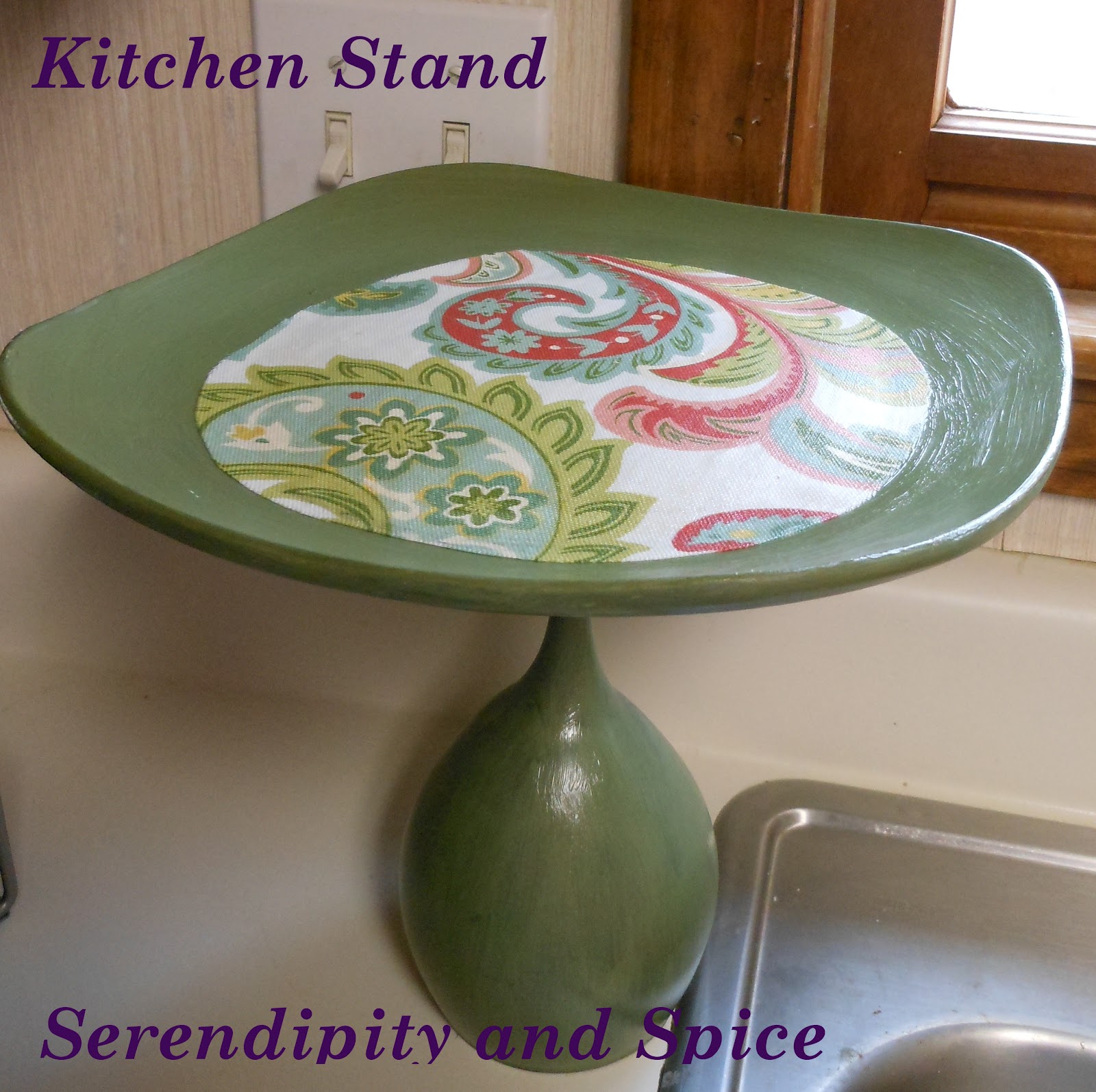 images+%25287%2529 My Pinterest Inspired Kitchen Stand So, I’m sure like everyone else, I’m completely addicted to Pinterest! If you don’t have a Pinterest account then you're saving a ton of time every day!  Anyway, I saw this adorable kitchen stand on Pinterest and decided that I wanted to make one for my kitchen. I hurried to the Dollar Tree but they didn’t have any candle sticks that were tall enough so….. Yep, that’s right, I used a wine glass!  And how fitting is a wine glass in the kitchen?!</p> Materials:</p> Plate (I chose a square one because I love square plates- they’re so different)</p> Wine Glass</p> Primer</p> Acrylic Paint (I used the cheap stuff from Michaels-- .69 each)</p> Fabric (optional)</p> Modge Podge (if you use the optional fabric)</p> Envirotex Lite (or any high gloss coating)</p> Glue Gun</p> Directions:</p> 1.   Spray primer all over plate and wine glass, let dry completely.</p> 2.   Paint plate and wine glass desired color.  I mixed CraftSmart’s Olive Green with Delta Creative’s Pearl Finish Ceramcoat because I thought a pearlized finish would be pretty- and I was RIGHT!</p> 3.   You may need a couple of coats.</p> 4.   Now, if you want to add the fabric to the plate like I did… just cut the desired shape and use Modge Podge to attach it to the plate.  Make sure that it doesn’t lift anywhere along the edge while it dries.</p> 5.   Use the glue gun to attach the plate to the wine glass.  I found that by turning the wine glass upside down the stand will be more stable.</p> 6.   Cover entire piece with a thin coat of Envirotex Lite to protect it from water from the sink.  If you’ve never used Envirotex Lite before it is AWESOME… but you have to be very careful with it as it likes to bubble up (use the flame of a lighter to remove bubbles while it’s drying), it likes to drip (make sure you brush off the drips before it dries or else it will look weird), and it takes several days to fully dry.  But, when you’re done it looks like you dipped your item in glass.  Note: I haven’t done the Envirotex Lite on this piece yet because I’m going to do several pieces at once.</p> I’m really loving this paisley fabric!</p> Definitely going to have to find other stuff to do with it!</p>