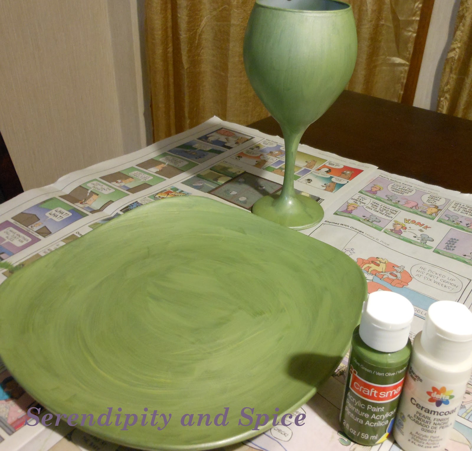 2.   Paint plate and wine glass desired color.  I mixed CraftSmart’s Olive Green with Delta Creative’s Pearl Finish Ceramcoat because I thought a pearlized finish would be pretty- and I was RIGHT!