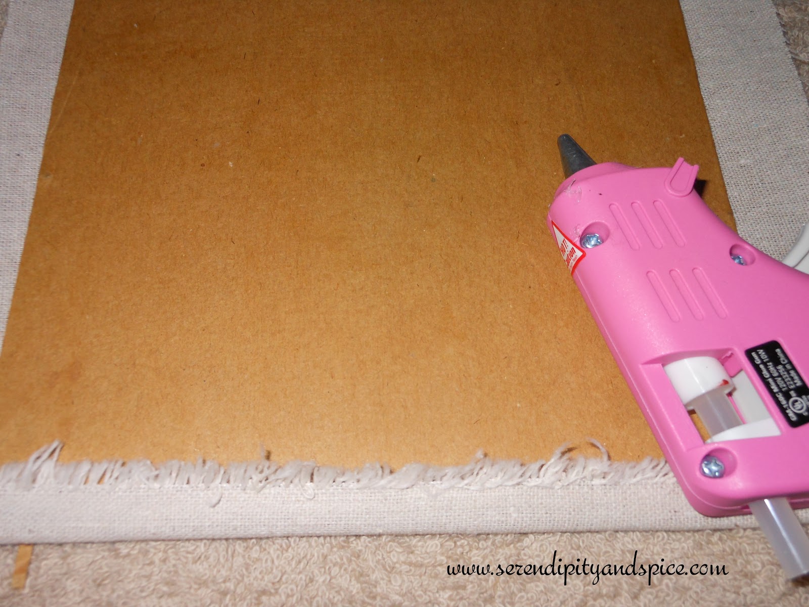 I used my hot glue gun (yep, I’m one of those girls that if it comes in pink then that’s the one I’m getting!) to secure the canvas to the back.