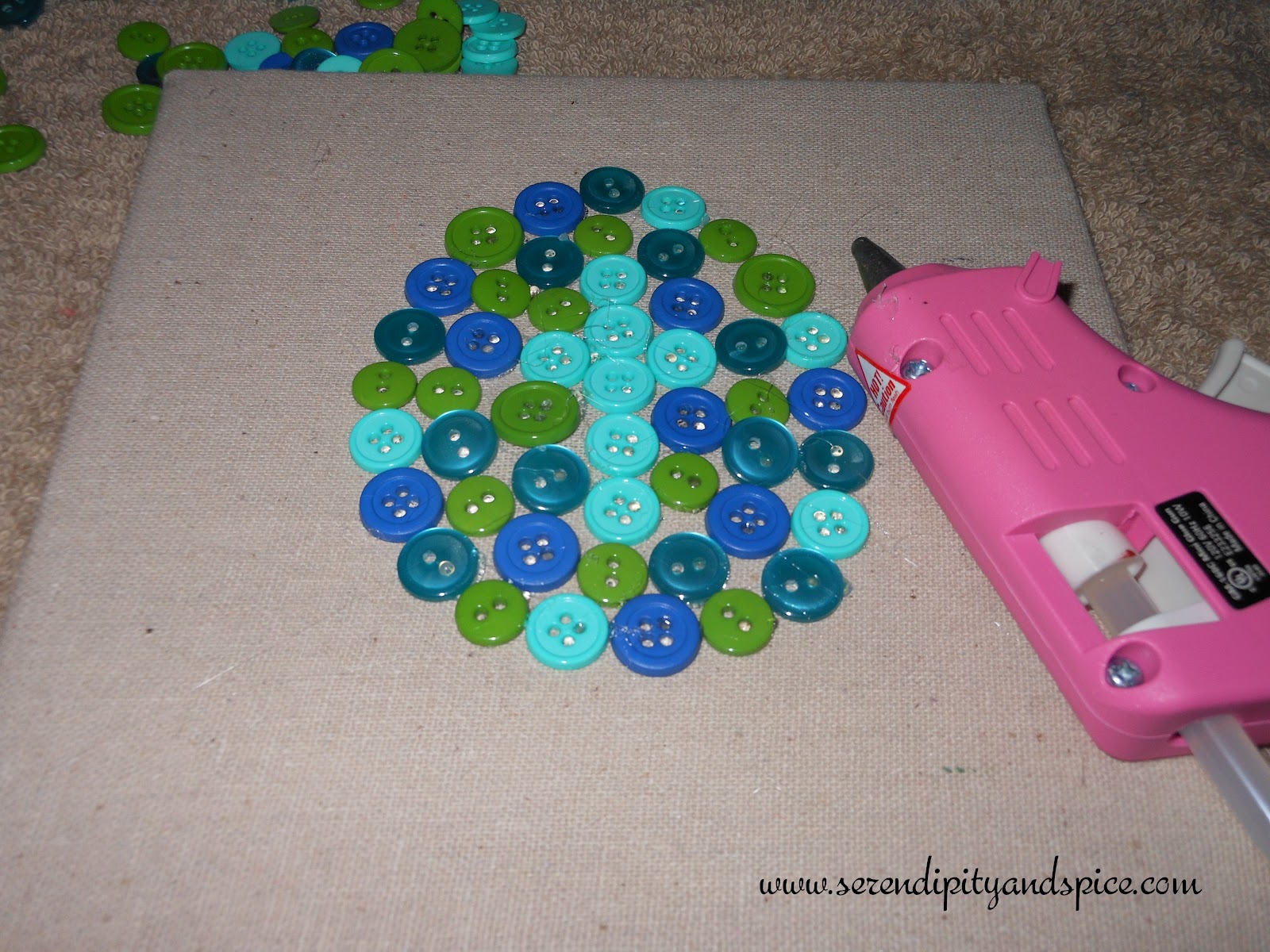 Since Easter is fast approaching I decided I needed some Easter decor around here so I arranged the buttons in an egg shape and hot glued them to my canvas. Like how I added the cross to the center? He is the reason for the season!